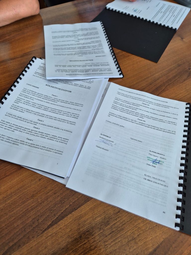 Dana 26. lipnja 2025. godine, Sindikat komunalnih, prometnih i srodnih djelatnosti Hrvatske, zastupan po sindikalnom povjereniku Vladimiru Bosančiću, sklopio je Kolektivni ugovor s Komunalnim društvom Grada Solina, kojeg je zastupao direktor Srđan Žižak. Ugovor je rezultat kvalitetnih, iscrpnih i korektnih pregovora između Sindikata i Uprave, a njime se svim djelatnicima društva osigurava stabilnost i sigurnost u ostvarivanju njihovih radničkih prava. Zahvaljujemo svim uključenima – članovima pregovaračkih timova, članstvu Sindikata, Upravi Društva te gradonačelniku Grada Solina – na suradnji i doprinosu u postizanju ovog važnog dokumenta za prava i interese radnika.